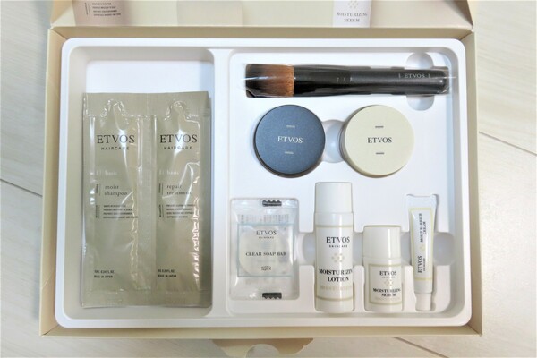 『ストレスフリーのミネラルメイク』をテーマにした『ETVOS』。今回試してみたのはファンデーション、下地、メイクブラシのミネラルメイク3点と、洗顔料、化粧水、美容液、スペシャルケアクリームのセラミドスキンケア4点、さらにシャンプー、リンスがセットになった計8点のセットです。