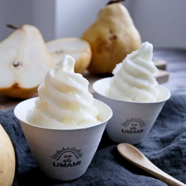 業務用のダシを製造・販売するフタバ(新潟県三条市)は西洋梨のルレクチエを使ったソフトクリームを期間限定で発売した。昆布だしを加えた「UMAMIソフトクリーム」の一環で、ルレクチエの甘みとうまみを引き出した。1個450円(税込み)で、三条市内の直営店で扱う。