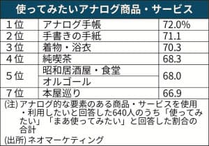 「アナログ」なサービスやモノの人気が高まっていることも、スナック人気の理由としてあげられる。ネオマーケティング(東京・渋谷)が17年に18~29歳を対象に実施した調査によると、SNS投稿者の75.3%が「アナログ的な要素のある商品・サービスを利用してみたい」と回答。利用してみたいサービスとして、「純喫茶」や「昭和居酒屋」などが上がった。