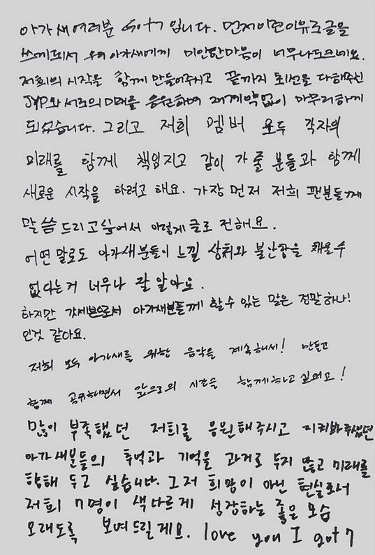 “พวกเราต้องการขอโทษเหล่าอากาเซ่อย่างสุดซึ้ง ซึ่งเป็นเหตุผลในการเขียนจดหมายนี้ พวกเราได้สิ้นสุดสัญญา และไม่ต่อสัญญากับ JYP Entertainment ที่เป็นจุดเริ่มต้นของเรา และพวกเราได้ทำงานอย่างหนักร่วมกันจนถึงท้ายที่สุด แต่พวกเราก็จะเป็นกำลังใจให้กันต่อไปในอนาคต
