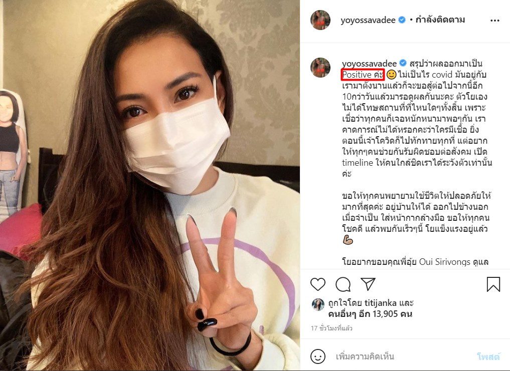 พร้อมกันนี้ โย เผยอีกว่า ภาวนาอยากให้ 10 วันที่นอนโรงพยาบาลหายจากโควิด เพราะ ตอนนี้คิดถึงบ้านมาก ซึ่ง โย คิดว่าตนเองเป็นคนแข็งแรงมาก แต่พอมาเจอโควิดสายพันธุ์ที่กำลังแพร่ระบาดในตอนนี้ ยอมรับว่าทำน็อกเลยทีเดียว และจะคอยอัพเดตอาการเรื่อยๆให้ทุกคนทราบ