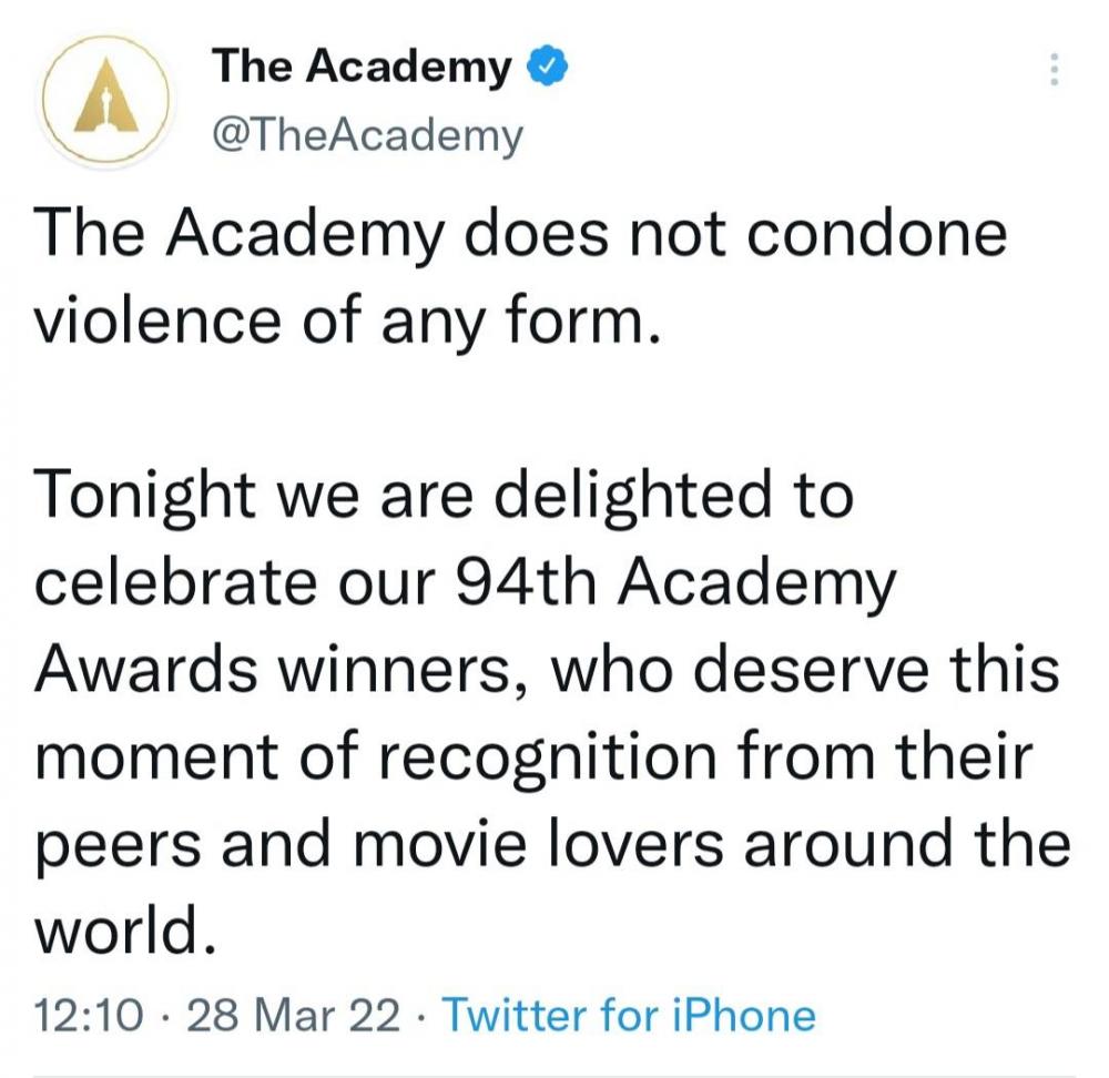 "อะคาเดมี ไม่สนับสนุนความรุนแรงทุกรูปแบบ ค่ำคืนนี้เราเฉลิมฉลองให้แก่ผู้ได้รับรางวัลอะคาเดมีครั้งที่ 94 ผู้ที่คู่ควรกับช่วงเวลาที่จะได้รับการยอมรับจากเพื่อนและแฟนภาพยนตร์ทั่วโลก" - อะคาเดมี